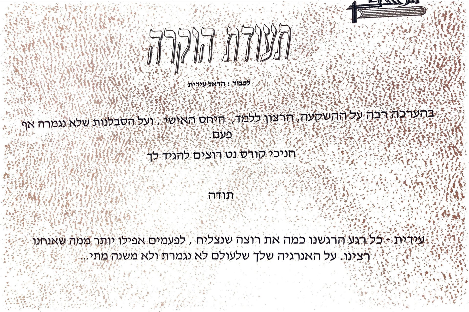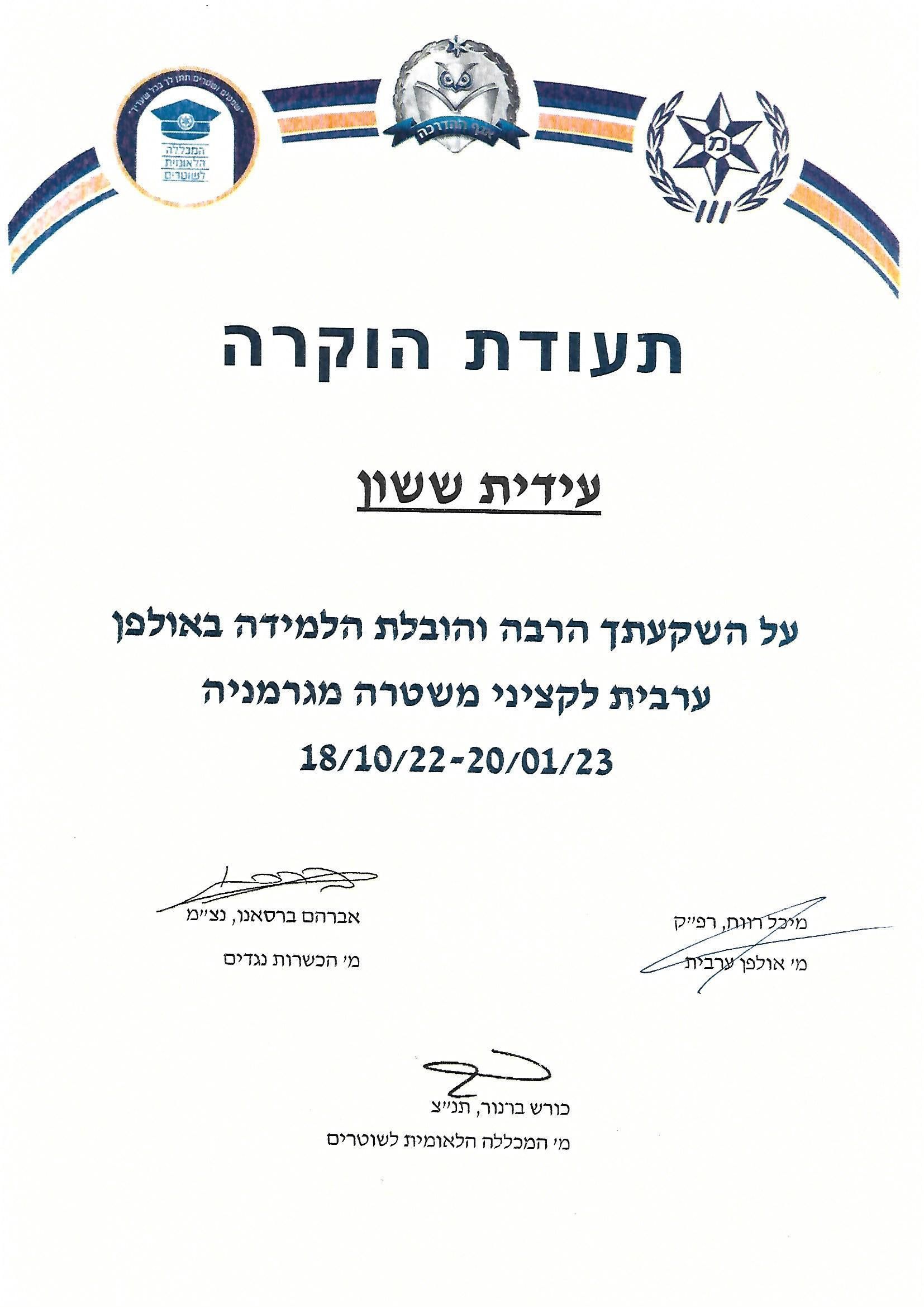"עידית היה לי העונג להיות התלמיד שלך אני חושב שהעשרת את הידע שלי בערבית בצורה המיטבית וקידמת אותי בידיעת השפה והבנתה. תודה רבה על הכל, מעריך מאוד"