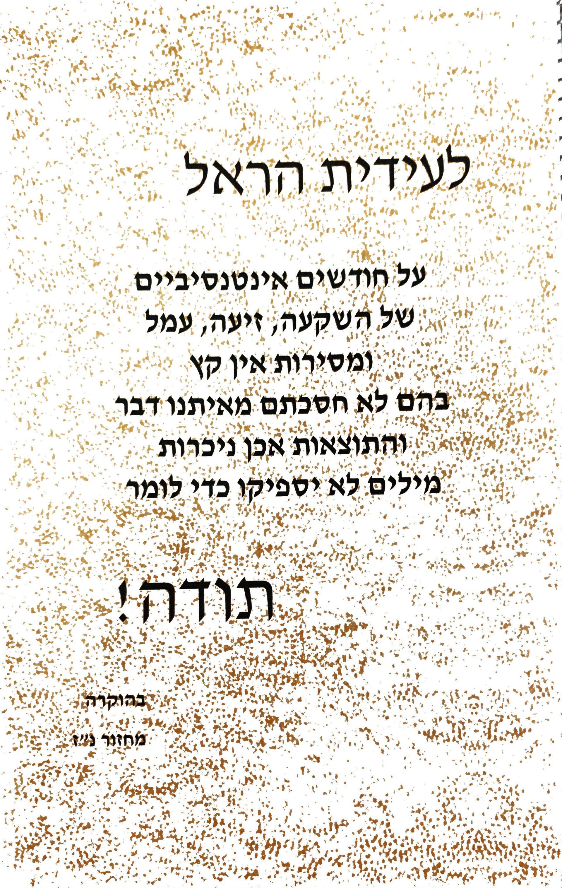 מאחל לך המון בריאות טובה והצלחה רבה ! בכל אשר תפני. אני בטוח שתשמשי מושא להערצה ודוגמה חיובית מאוד ליחסי אנוש מעולים, סדר וארגון מקצועי🌹