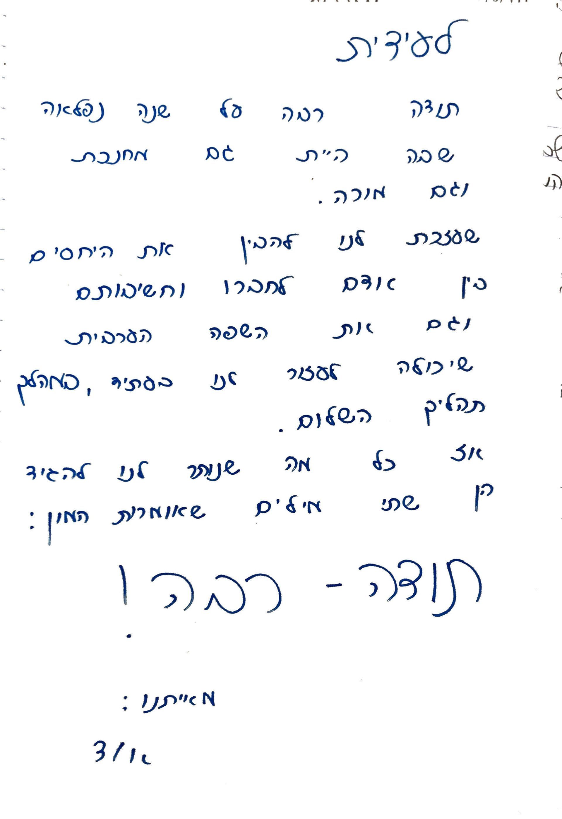 "עידית, אין לי כל כך מה להרחיב מעבר לזה שלא הייתי מסיימת בגרות אם לא היית המורה שלי. עזרת לי בהרבה יותר ממובן אחד. את מורה שאזכור לעוד הרבה מאוד זמן."