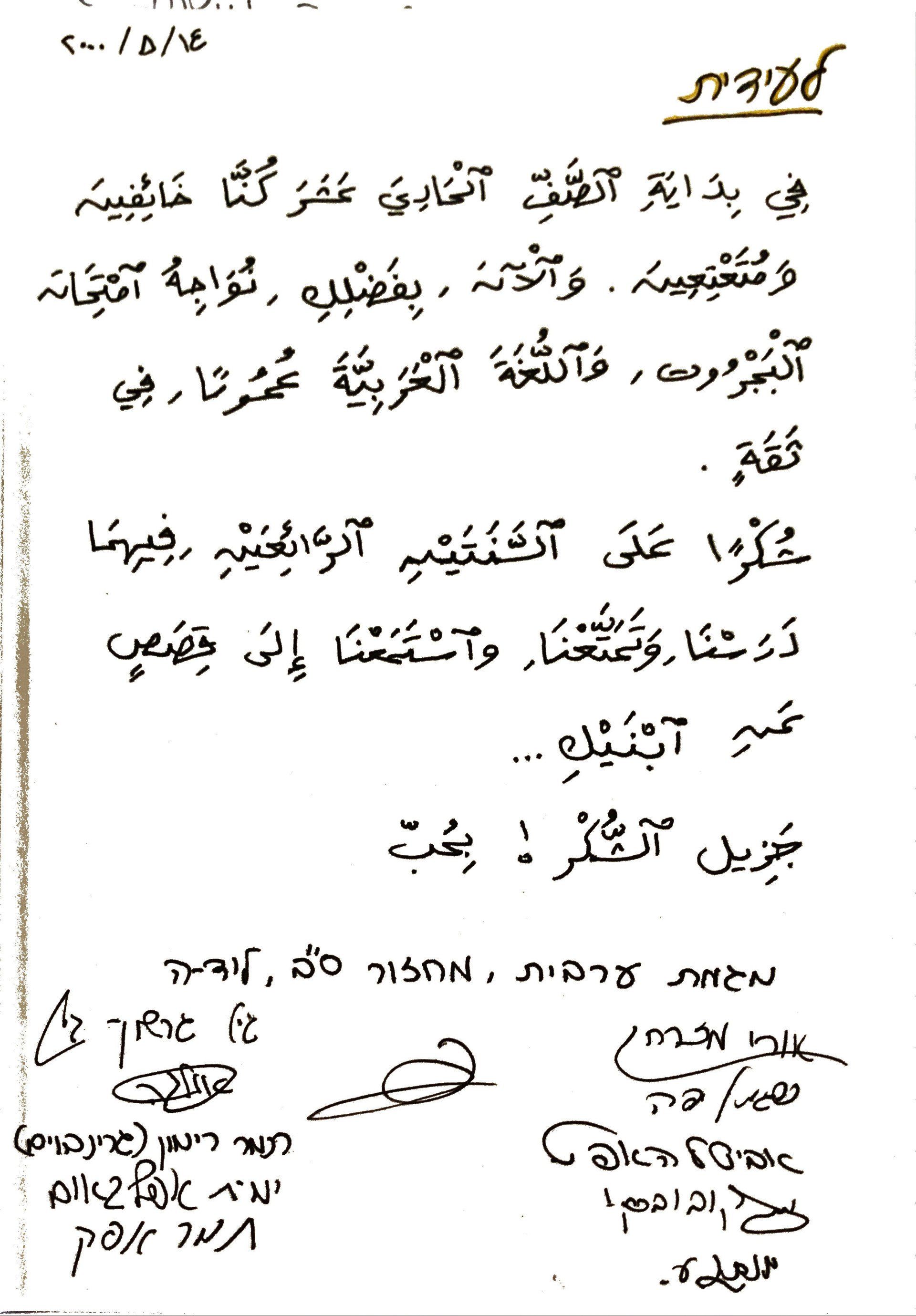 תודה רבה לכולכם על חודשים מעניינים, כיפים ומצחיקים. נהנתי המון ולמדתי המון. תודה נפרדת לעידית- זה היה בין הקורסים המוצלחים שלקחתי, למדתי על השפה הערבית ומעט ערבית, נשברו לי מחסומים (פסיכולוגים) על ערבים- הבטחון העצמי שלי עלה, והקורס, על אף היותו קצר השפיע עלי לטובה וייזכר כחוויה לימודית חיובית.
