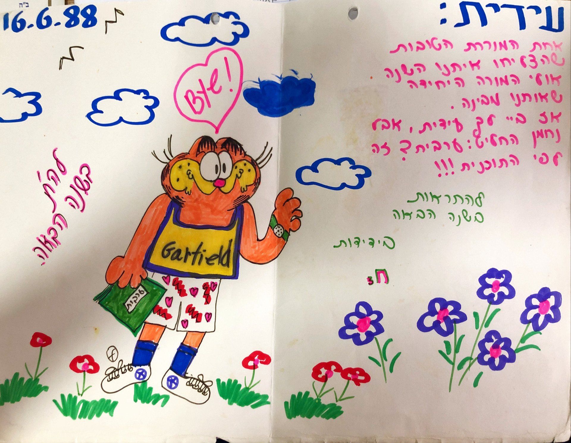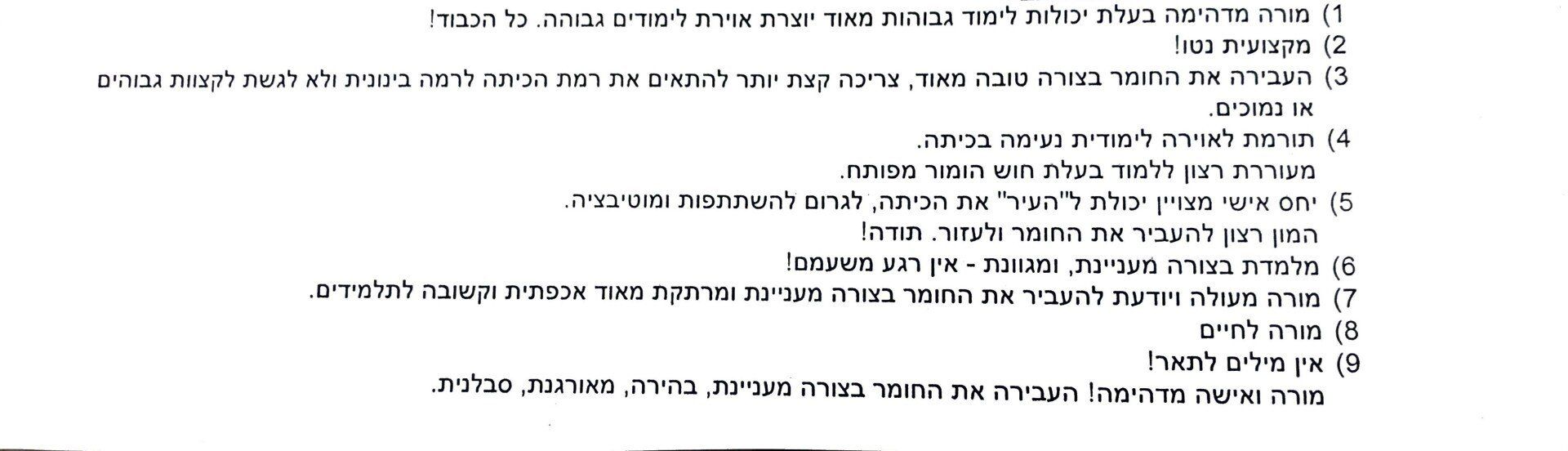 "את מורה נהדרת, שהיה לי נעים לחלוק איתה את השנים האחרונות במגמה, השיעורים הועברו בצורה שאיננה שכיחה מנסיוני ושהותי במהלך בית הספר במובן חיובי כמובן, את בן אדם אנושי שכיף להיות בחברתו גם בגלל אישיותך, וגם בגלל הידע העשיר שאת מביאה עימך."
